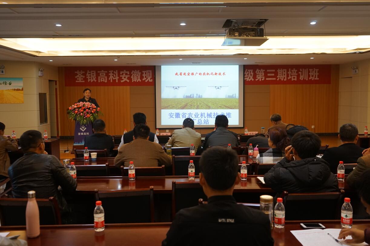 ??? 2018年12月3日,荃銀高科安徽現代農場主2017級培訓班第三期培訓開班儀式在公司六樓多功能廳舉行。安徽荃銀高科董事長張琴、營銷總監王玉林,培訓班總教務長楊惠成老師,安徽張海銀種業基金會秘書長張彤,及來自全省各地100多位從事農業種植的青年農場主學員參加了本次培訓。